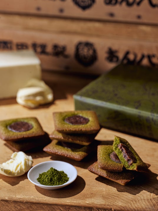 宇治抹茶の閑かな薫りが『あんバタ』の旨味を持て成す。碾茶を忍ばせより薫りの立った抹茶と、丁寧に焦がしたバターが染み入ったフィナンシェ生地で、北海道千歳産『えりも小豆』餡子を包み込んだ。桜舞い散り、蝉の声を聴きながら、心閑かに味わって頂きたい。