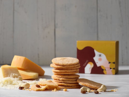 厳選したチーズと生クリームを贅沢に練りこんだ生地を丁寧に薄焼きにして仕上げました。馴染みのあるチーズ感のゴーダとやわらかな風味のチェダーをブレンド。どなたにも食べやすい味に仕上げました。カシューナッツとレーズンも添えました。食べた瞬間に口いっぱいにひろがる風味と、ホロリとくずれる口どけの良さは、限界まで入れたチーズと、この薄焼きだからこそ。