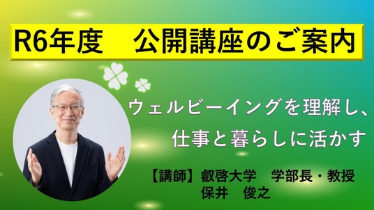 この講座は、ウェルビーイング学会監事でもある、本学、保井俊之教授が、ウェルビーイングの概念についてわかりやすく説明し、個人やグループでのワークを交えて、実現したいウェルビーイングのカタチが自ら設計できるスキルを、学べる講座となっております。