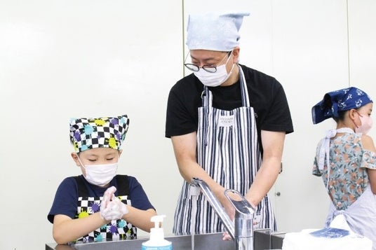 お寿司を実際に作る前に、正しい「手の洗い方」を先生に教えてもらいます。