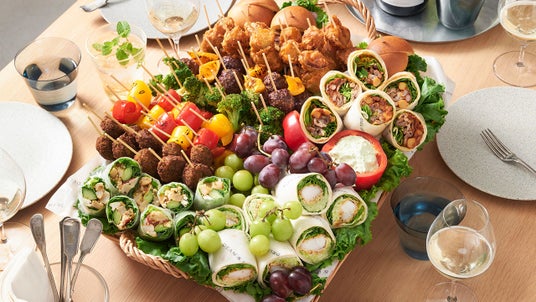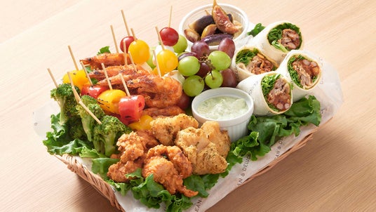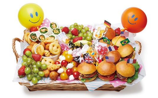 ミニハンバーガーやポップコーンシュリンプなどのお子さまが喜ぶメニューから、フルーツやお菓子などのデザートまで。遊び心が詰まった、ファミリーパーティーにぴったりのバスケット。