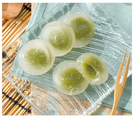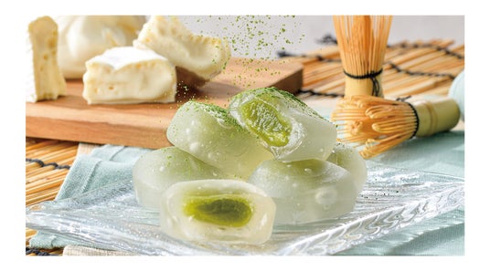 マスカルポーネチーズとカマンベールチーズをブレンドした抹茶餡を甘みのあるもちもち食感のわらび餅で包み込みました。宇治抹茶とチーズの絶妙なコンビネーション。和洋の美味しさをお楽しみください。