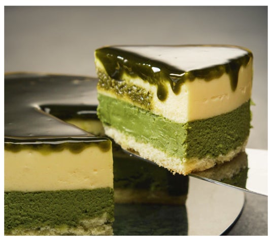 下層は抹茶のベイクドチーズケーキ。上層はレアチーズのムース。表面には抹茶のナパージュをかけ濃い抹茶の苦みを感じるチーズケーキです。