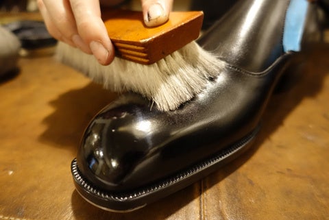 西上氏がお客様の1足を丁寧にクリーニングし、最高級靴クリームでお手入れします。