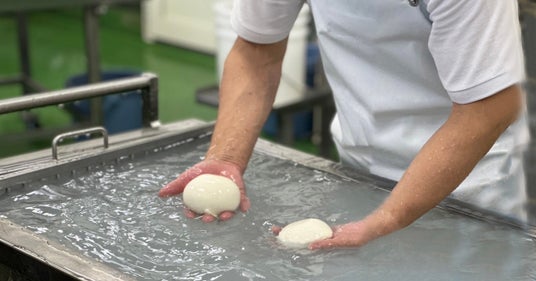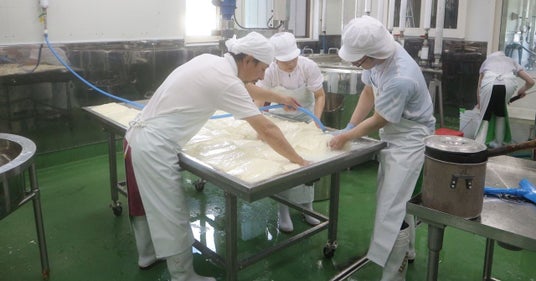 成型後のチーズの状態を確認しているシーン。