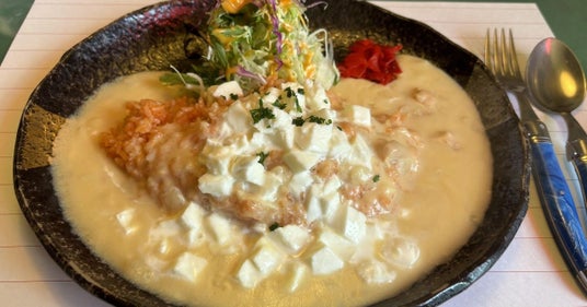 白糠町内の飲食店では、酪恵舎のチーズを使ったメニューを味わうことができます。こちらは、レストランはまなすの「酪恵舎モッツァレッラの白いチーズ・カレー」。