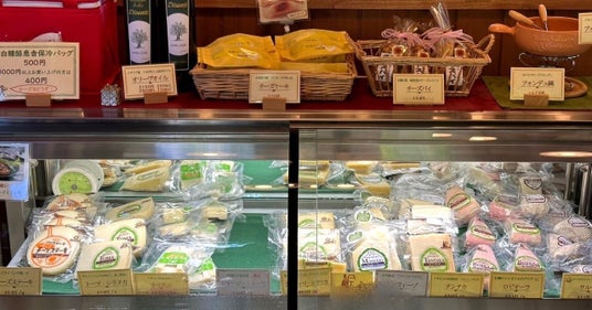 直売店には、さまざまな種類のチーズが並んでいます。各チーズにおいしい食べ方が記されており、食材としてのチーズであることがよくわかります。