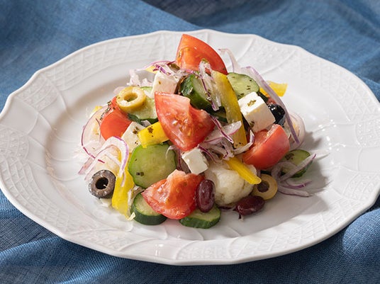 トマトやキュウリ、パプリカなどの彩り夏野菜とホワイトチーズをオレガノを効かせたドレッシングでサッパリと仕上げました。