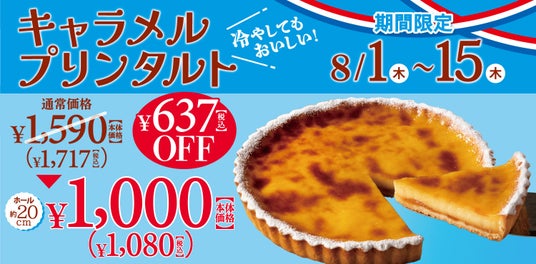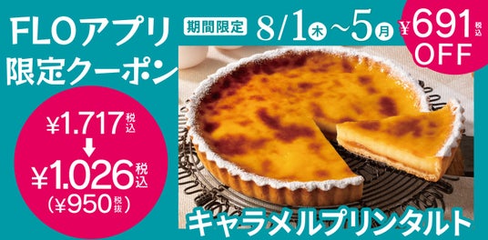 8月1日(木)~5日(月)には、「キャラメルプリンタルト」がなんと“税込691円引き(税抜950円)”になる超お得なクーポン配信キャンペーンを開催!店頭特価価格よりもさらにお得にご利用いただけます!