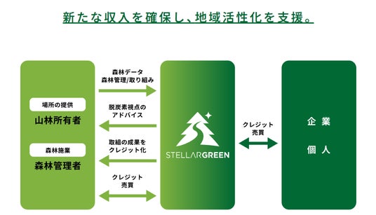 現在、カーボンニュートラルの実現に向けた取り組みの強化が求められる一方で、森林管理者および自治体は、森林カーボンクレジットにおける申請手続きの複雑さ、費用の負担、販売先の開拓といった多くの課題に直面しています。こうした状況を解決すべく、ステラーグリーンは森林カーボンクレジットの生成から販売まで、成功報酬型のワンストップサービスを提供しています。また、専門性が求められる森林データの収集や申請書作成にも対応しており、森林カーボンクレジットの生成から販売まで多角的にサポートいたします。