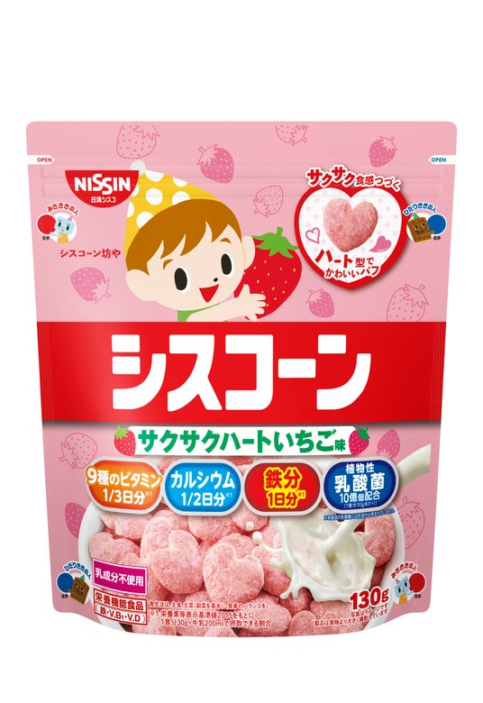 今回、「シスコーン」史上初となる“ハート型”で軽い口当たりのパフ状シリアルを使った「シスコーン サクサクハート いちご味」を期間限定で発売します。