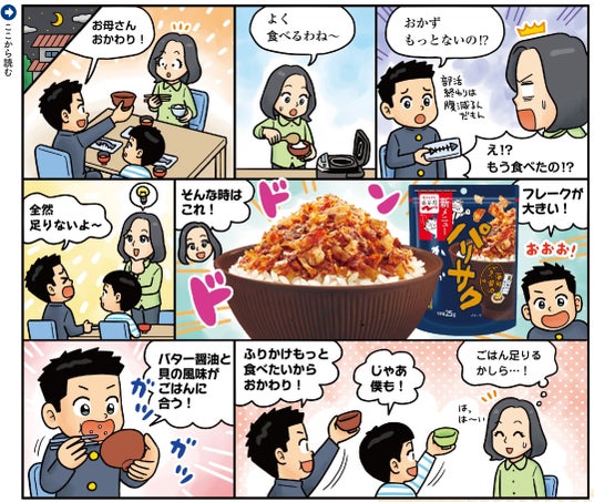 「パリサクかつおふりかけ」はごはんをたくさん食べたい食べ盛りのお子さんと、たくさん食べさせてあげたいけどおかずを用意するのは大変な親御さんに満足していただけるよう開発した商品です。