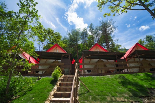 木々の緑に赤いテントの屋根が映えるウッドデザインパーク与位は、兵庫県第2の面積を誇り、さらに