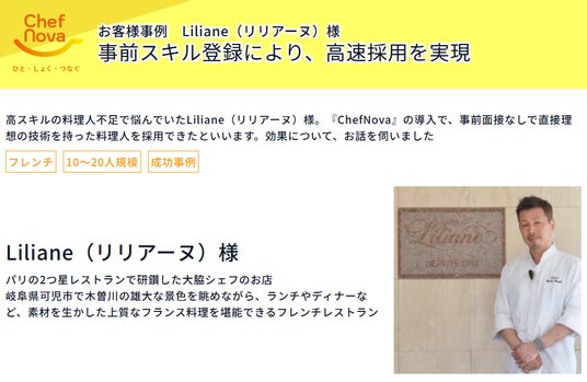 技術を持った料理人の頭数が減少傾向にある昨今で、欲しい日に、欲しい技術の方に援助いただけるサービスとのことで、そんなサービスがあれば是非取り入れたく、今回ChefNovaを導入しました。