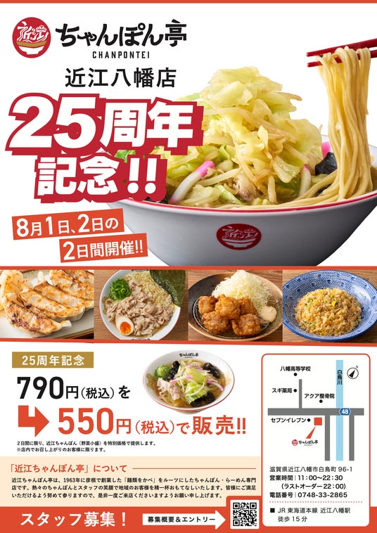 8月1日(木)と8月2日(金)の2日間に限り、近江ちゃんぽん(野菜小盛)を感謝価格の550円(税込)でご提供いたします!(通常価格790円)