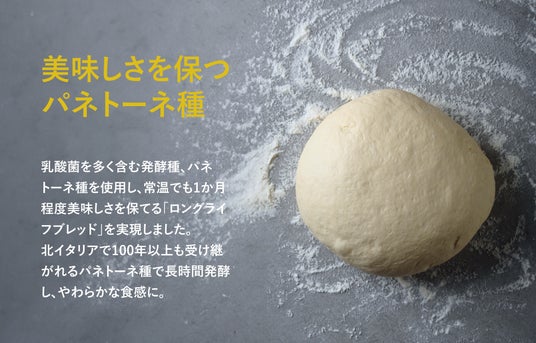 発酵種には、酵母と保存性を高める乳酸が共存する珍しい「パネトーネ種」を使用。乳酸菌の効果で長期間ふっくらした美味しさが続く「ロングライフブレッド」を実現しました。