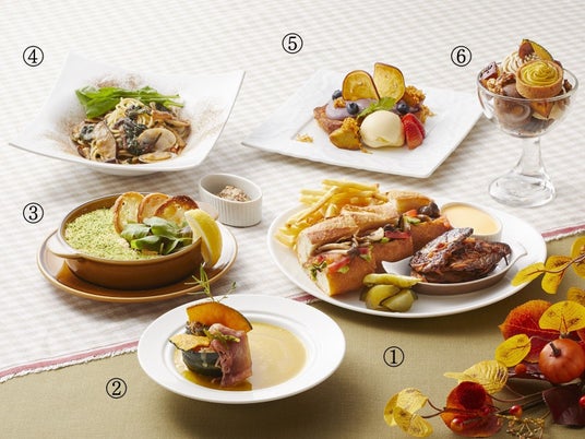 「シンフォニー」と「フォンテーヌ」では、秋の豊かな食材を、趣向を凝らしたアレンジでお楽しみいただけるメニューをご用意いたします。ローストした坊ちゃんカボチャを入れた、インパクト抜群のカボチャのポタージュや、ポルチーニ、しめじ、マッシュルーム、シイタケなどキノコをふんだんに使用した、芳醇な香りが広がるバター醤油 スパゲッティーなど秋らしい味わいを揃えました。香ばしいバゲットに、グリルステーキ、オニオン、マッシュルームを加え、たっぷりとチーズソースをかけてお召しあがりいただく食べ応え抜群なサンドウィッチなどもご用意。また、サツマイモのクリームやカラメリゼしたサツマイモを合わせ、ふんわりと仕上げたフレンチトーストや、秋の味覚をふんだんに使用したパフェなど、スイーツも2種類ご用意いたしました。