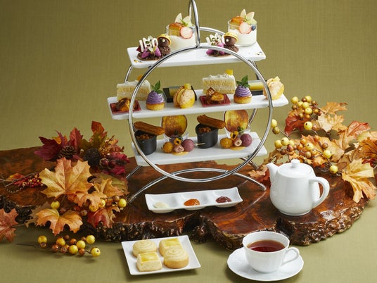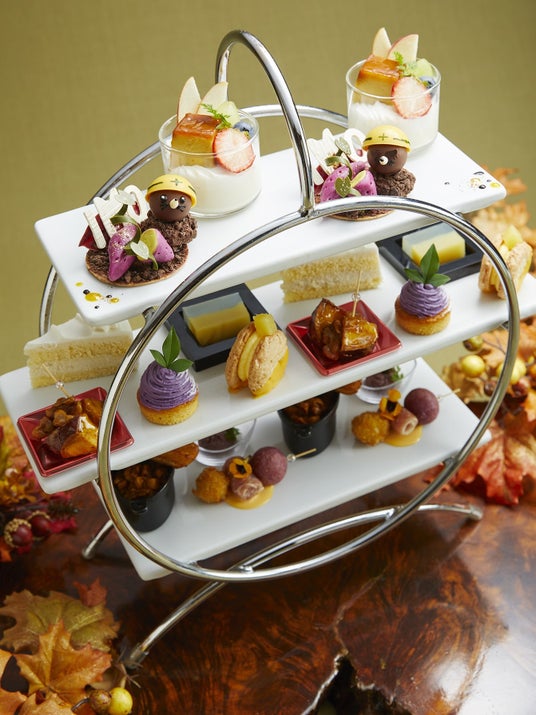 「フォンテーヌ」では、秋の人気食材“さつまいも”をプリンやケーキ、羊羹、大学いもなど多彩な調理法でアレンジしたアフタヌーンティーが初登場。トップスタンドでは、さつまいも堀りに夢中になるモグラをイメージしたチョコレート細工がお出迎え。グラスデザートは、なめらかで濃厚なさつまいもをお楽しみいただけるプリンを主役に、リンゴやマスカットなどをトッピングしました。また、メープルシロップとクルミで洋風にアレンジした大学いもや、さつまいもとさっぱりしたすだちの2つの味わいをお楽しみいただける羊羹など和スイーツもご用意。栗の食感と優しいさつまいもの甘みが好相性のショートケーキや、しっとりとしたマドレーヌとむらさきいものモンブラン、ココナツの香りが口に広がる干しいものダックワーズなど、パティシエこだわりのスイーツをラインナップしました。