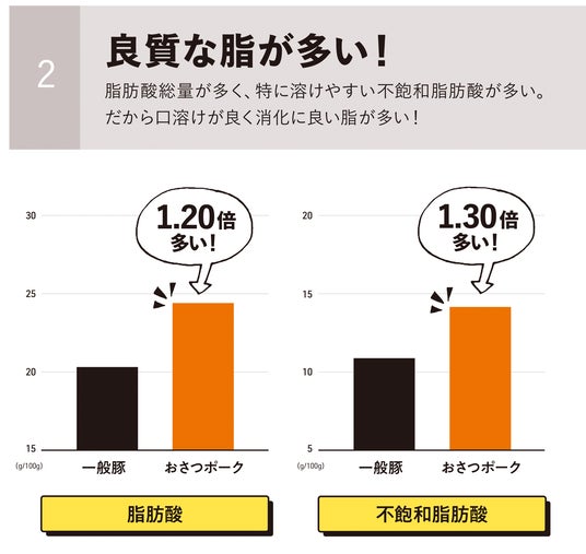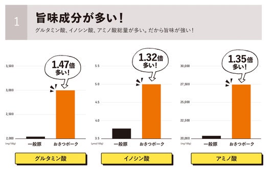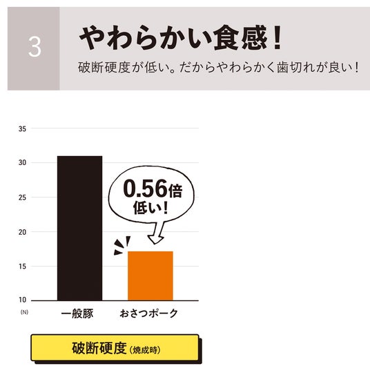 おさつポークは一般国産豚と比較して「旨味が強く、良質な脂の多い、柔らかい豚肉」であることが成分分析調査により明らかになっています。