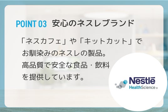 ネスレ ヘルスサイエンスは、2011年食品飲料業界のリーディングカンパニーである「ネスレ」によって創設された、先進的なヘルスサイエンスカンパニーです。世界140カ国以上で、12,000人以上の社員が在籍し、消費者向け健康製品、医療介護施設向け栄養補助製品、科学的知見を取り入れたビタミンやサプリメントなど、幅広いブランドを展開しています。「高い付加価値」と「グローバルな研究開発力」を強みとし、「栄養の力」を基軸に、総合的に健康をサポートする提案をしています。