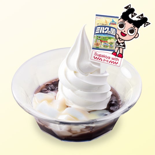スガキヤのロングセラー商品「クリームぜんざい」が、春日井製菓のロングセラーキャンディ「ミルクの国」風に大変身。スガキヤ定番のソフトクリームにミルクの国風味のソースをかけ、ミルクの国風味のプリンを添えました。