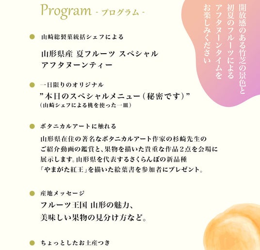 当日はフレッシュな果実にこだわる山崎隆光シェフによるアフタヌーンティー、ボタニカルアートの展示など、様々な角度から山形県産果物を楽しむ体験をお届けします。