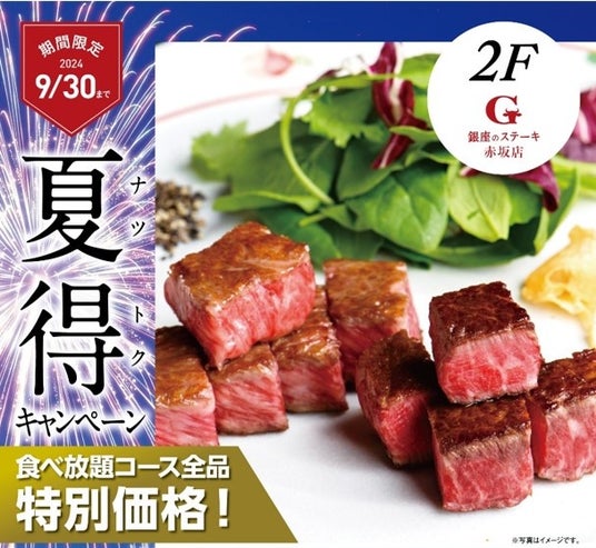 株式会社ベルーナ(本社:埼玉県上尾市、代表:安野清)の子会社である株式会社エルドラドが運営する鉄板焼レストラン「銀座のステーキ 赤坂店」は、8月1日(木)~9月30日(月)の期間限定で食べ放題コース全品特別価格キャンペーンを開始します。