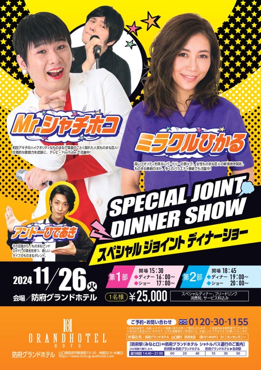 愛グループ(株)日本セレモニーが運営するホテル「防府グランドホテル(公式HP:https://www.hofu-grandhotel.com/)にて、2024年11月26日(火)に、「スペシャルジョイント ディナーショー」を開催いたします。