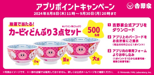 また、8月8日(木)11時から、『カービィどんぶり3点セット』(小盛・並盛・大盛の3点/メラミン製)が抽選で500名様に当たるアプリポイントキャンペーンを実施します。本キャンペーンには吉野家公式アプリをダウンロードすれば、どなたでも参加可能です。店頭レジにて吉野家公式アプリ画面上のキャンペーンバーコードを提示すると、税込500円ごとに1ポイントが会計日含めて4日以内にアプリに付与されます。このポイントを使って吉野家アプリ内の専用フォームよりご応募いただけます。応募期限は10月10日(木)23時59分まで、1ポイントで1口から何度でも応募可能です。