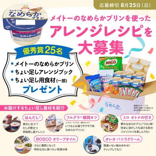 協同乳業株式会社(本社:東京都中央区、代表取締役社長:宮崎 幹生)は、メイトーのなめらかプリンのアレンジレシピコンテストを8月1日よりX・Instagramにて開始します。本コンテストでは「メイトーのなめらかプリン」シリーズにぴったりのアレンジレシピをご投稿いただき、優秀賞に選ばれた25名に「ちょい足しアレンジブック」やちょい足し食材を詰め合わせてプレゼントいたします。