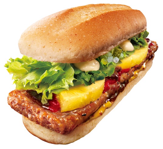 商品概要:ポークパティに鉄板で焼いたパインを合わせ、オリジナルBBQソースとハニーマスタードソース、特製旨辛ソース、玉ねぎとピクルスのレリッシュなどとともに小麦の風味が豊かな全粒粉入りロールパンで挟みました。パインの程よい酸味と特製旨辛ソースのスパイシーな風味が夏にぴったりな一品です。