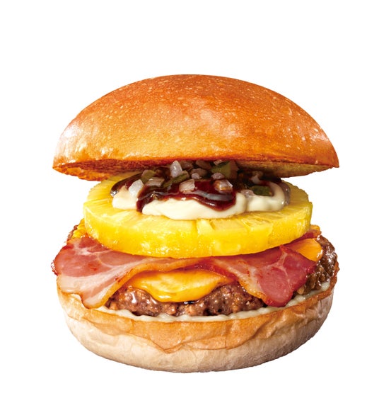 商品概要:ロッテリアの人気商品「絶品チーズバーガー」をハワイ風にアレンジした商品です。牛肉100%のパティに鉄板で焼いたパインを合わせ、自社製ベーコン、レッドチェダーとともにふんわりもっちり食感のバンズで挟みました。フルーティーかつスモーキーな風味が特長のオリジナルBBQソースとじっくり燻製させたベーコンの香りが食欲をかきたてます。まろやかなとろ~りチーズソースと甘酸っぱいパインのコンビをお楽しみください。