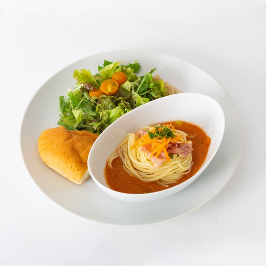 ひんやりガスパチョ風ソースは、にんじんジュースでより食べやすく、生ハムとにんじんのトッピングで見た目にもおしゃれに仕上げました。
