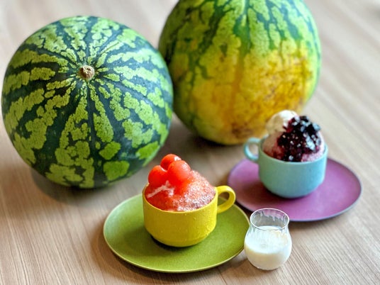 「規格外スイカのかき氷」に地元・伯耆町(ほうきちょう)「上代(かみだい)」のあま酒シロップを添えて。同時期に鳥取県産ブルーベリーのかき氷も提供。