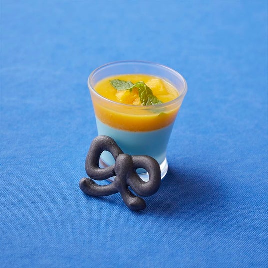 ブルーカラーのプリンに色鮮やかなマンゴーをあしらった、夏らしいトロピカルなデザート。