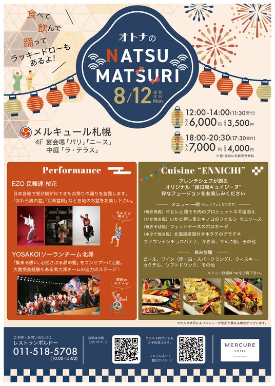 メルキュール札幌(所在地:札幌市中央区南4条西2丁目2-4 総支配人:カーセル クリストファー) は、2024年8月12日(月曜日/振替休日)、夏祭りをテーマにしたランチとディナーのイベント、『オトナのNATSUMATSURI』を開催致します。