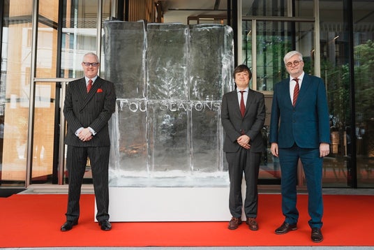 開業セレモニーには、事業主であるHotel Properties Limited 日本代表 マイケル・インマン氏、東京建物株式会社 取締役専務執行役員 秋田秀士氏、フォーシーズンズホテル大阪 総支配人のアレスター・マカルパインが出席し、「船の帆をほうふつとさせるシンボリックな外観」「水都大阪」から連想させる氷のモニュメントが登場しました。