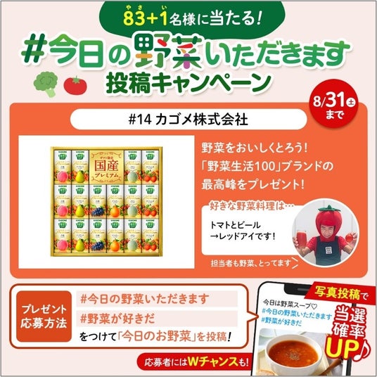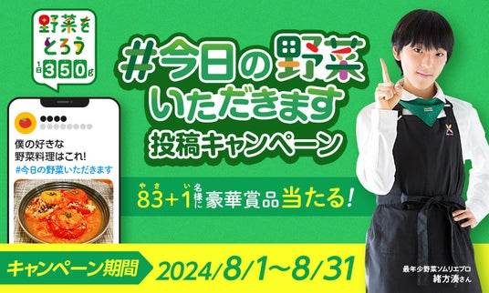 カゴメ株式会社(代表取締役社長:山口聡、本社:愛知県名古屋市)は、野菜摂取推進活動「野菜をとろうキャンペーン」の賛同企業と最年少(※1)野菜ソムリエプロ緒方湊さんと共同で、2024年8月1日(木)から8月31日(土)「野菜の日」までの約1か月間、野菜がもっと身近になるX投稿キャンペーンとして2つの企画を実施いたします。