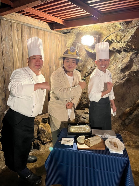生野銀山でシュトーレンの蔵入れを行う8月中旬は最高気温35度を越える、まだまだ残暑が厳しい時期、外はこんなに暑いのに生野銀山の坑道は、何と「13度!」という涼しさにきっと驚かれる事と思います。 また、8月のお盆明けのこのタイミングに、年末の12月に食べるXmasのお菓子の話題というギャップが、なんともユニークな話題という事で毎年多くのメディアから取材の申込が殺到!!