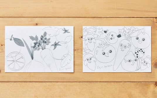 製造は、障がい者が能力を十分に発揮し、いきいきと働ける職場を提供する、東京都チャレンジドプラストッパン株式会社(TOPPANホールディングスおよび、東京都と板橋区の共同出資により設立)へ委託。同社で一枚ずつ丁寧に紙漉きした紙を使用し、野菜をモチーフに、2種類のデザインで展開します。塗り絵もできる、モノクロ仕様です。