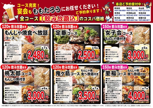 飲み放題付きコース充実!宴会もももたろうにお任せください!全コース「飲み放題込」「2,480円からのコスパ価格」!