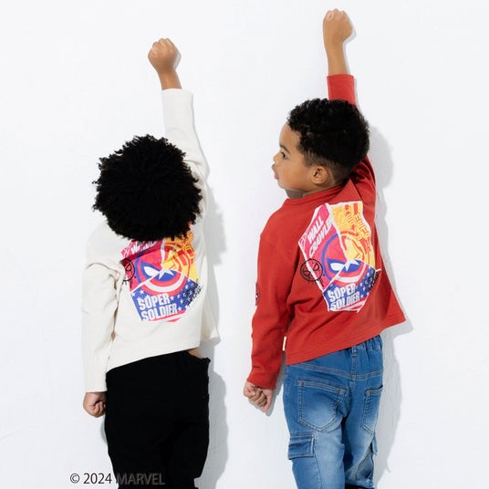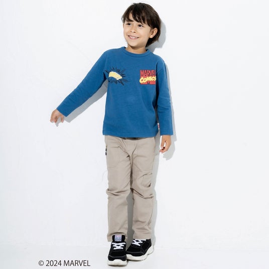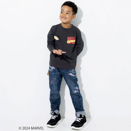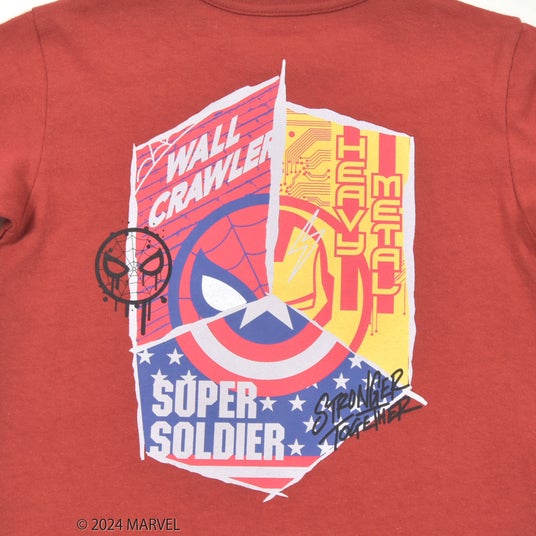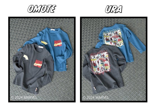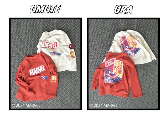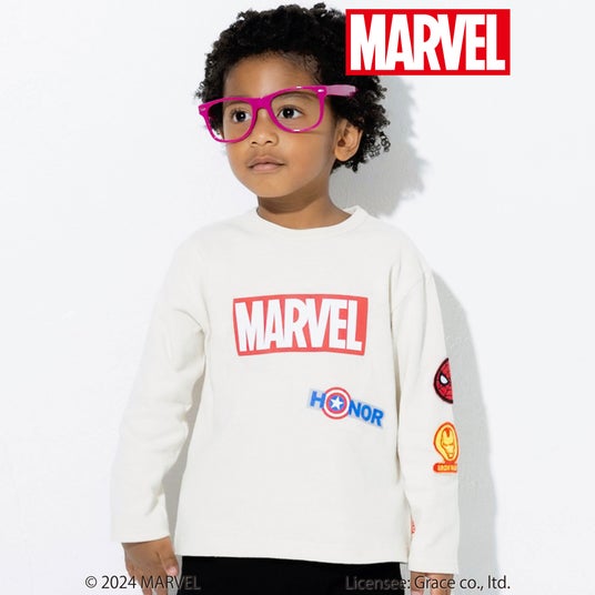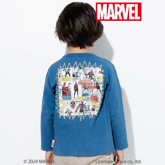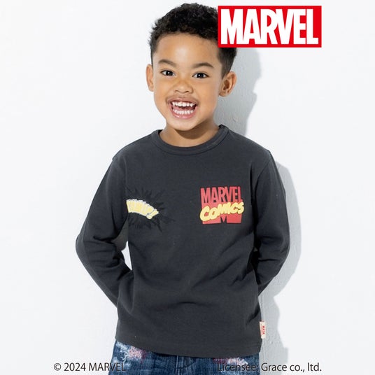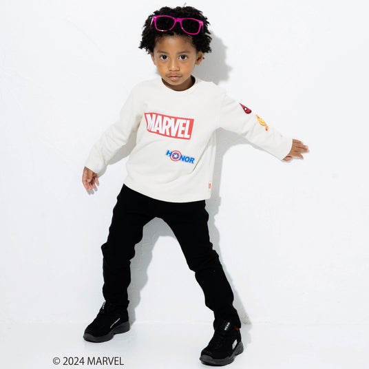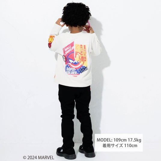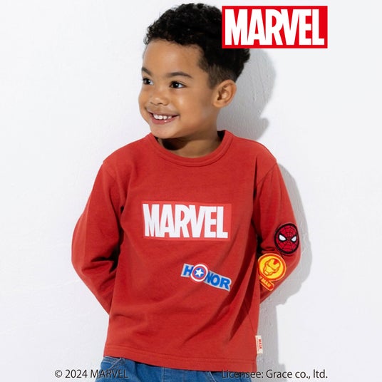 フロントには発泡プリントを使用した立体的な「MARVEL(マーベル)」のロゴと『キャプテン・アメリカ』のモチーフ、袖には『アイアンマン』と『スパイダーマン』のワッペンをほどこして細部までこだわったデザインになっています。