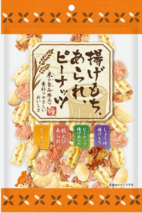 「揚げ餅、あられ、ピーナッツ」は人気のピーナッツ揚げ、国産米100%使用のしょうゆ揚げ餅、えびの香りいっぱいの歯ごたえのあるえびあられ、箸休めのピーナッツの4種をミックス。綺麗な彩りとすべて異なる種類の米菓を楽しむことができます。