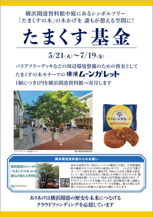 横浜開港の歴史・文化を活かしてより多くの方々とつながっていく、そして横浜のシンボルであるたまくすの木を未来へつなげていくこのプロジェクトに、弊社の経営理念「地域に貢献する」のもと、お菓子を通じた支援ができればと寄付させていただきました。ご賛同いただいたすべてのお客様に厚く御礼申し上げます。