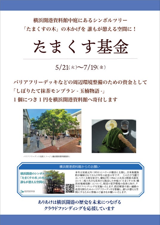 株式会社ありあけ(横浜市中区日本大通36、代表取締役社長 堀越隆宏)は、横浜開港資料館(所在:横浜市中区、館長:西川武臣、管理運営:公益財団法人横浜市ふるさと歴史財団)が令和6年5月21日(火)から7月19日(金)まで実施したクラウドファンディング「横浜開港の歴史を未来につなげる「たまくすの木」に憩うバリアフリーデッキを作りたい!」への支援金として、「横濱ムーンガレット」と、レ・ザンジュ・ベイ・ヨコハマ 2階カフェメニュー「しぼりたて抹茶モンブラン~玉楠物語~」の売り上げ 1個につき1円を寄付する「たまくす基金」により、総額300,000円を寄付したことをご報告いたします。