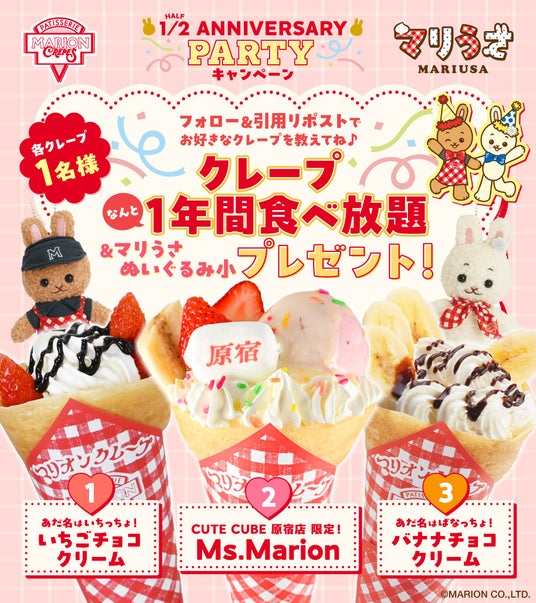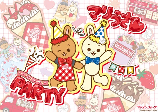 日本初の紙巻きクレープ専門店株式会社マリオン(本社:東京都渋谷区、代表取締役社長:平田照)から、今年2月2日の「クレープの日」に誕生した公式キャラクターの「マリうさ」。8月2日(金)にむかえるハーフアニバーサリーを記念し、アニバーサリーイベントを開催いたします。