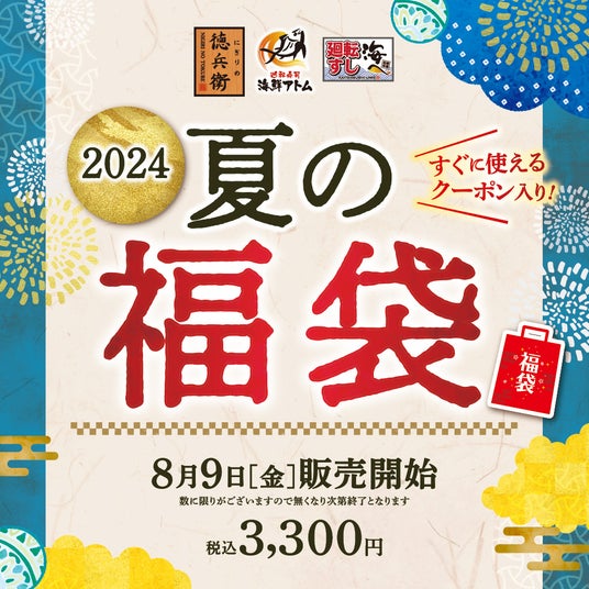 コロワイドグループの株式会社アトム(本社:神奈川県横浜市 代表取締役社長:田中公博)は、回転寿司業態の「にぎりの徳兵衛」「海鮮アトム」「海へ」の計45店舗で、2024年8月9日(金)から【夏の福袋】を数量限定で販売いたします。