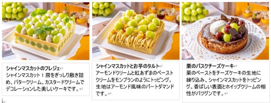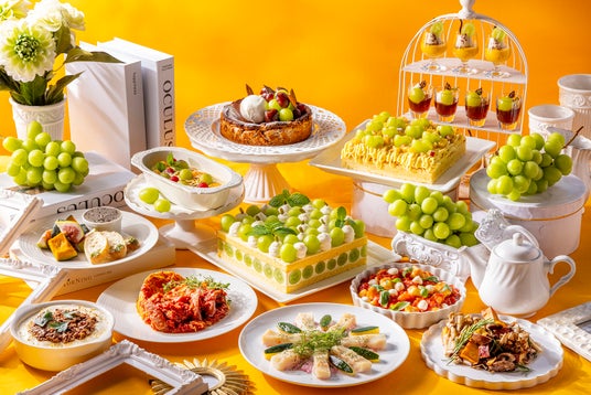 シャインマスカットのフレジェ/シャインマスカットとお芋のタルト/栗のバスクチーズケーキ/紅茶ゼリー&シャインマスカット/かぼちゃプリン/シャインマスカットのザバイオーネ(ライブパフォーマンス)/フレッシュフルーツ:グレープフルーツ・ぶどう・ライチ/白玉あんみつ/パンケーキ(カスタマイズコーナー)/バニラアイスクリーム/巨峰シャーベット/チョコレートアイスクリーム