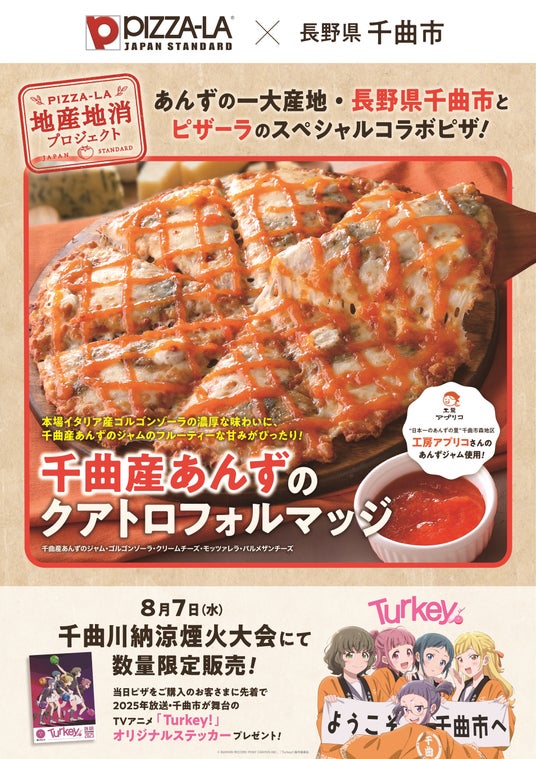 株式会社フォーシーズ(本社:東京都港区南青山 代表取締役会長兼CEO:淺野幸子)が展開する宅配ピザ「PIZZA-LA」は、同社「地産地消プロジェクト」の取り組みとして長野県千曲市と協力し、千曲市の特産品「あんず」を使用した地産地消ピザ「千曲産あんずのクアトロフォルマッジ」を、2024年8月7日(水)に開催される「第93回信州千曲市千曲川納涼煙火大会」打ち上げ会場(千曲川河川敷)にキッチンカーで出店し、販売いたします。また2025年に放送予定の千曲市が舞台となるテレビアニメ「Turkey!」ともコラボし、先着購入者へ「Turkey!」のステッカープレゼントも実施いたします。