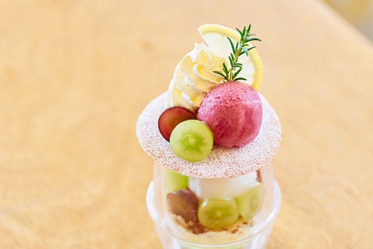 シャインマスカットの果実やシャーベット、ジュレを使用したぶどう尽くしのパフェ